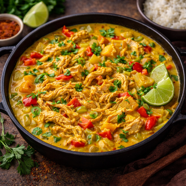 Råvarer og tilberedning: Vores kok har sammensat denne klassiske ret med omhu, og den består af Slow Cooked Shredded Chicken, der er mørt og neutralt i smagen, samt friske peberfrugter, æbler og andre grøntsager, som tilføjer farve og tekstur til retten. Den fyldige karrysovs er lavet med fløde, hvilket giver en rund og cremet konsistens, og karrysmagen er mild og afrundet. Den møre kylling og de friske grøntsager harmonerer med sovsen og giver et fyldigt og mættende måltid.