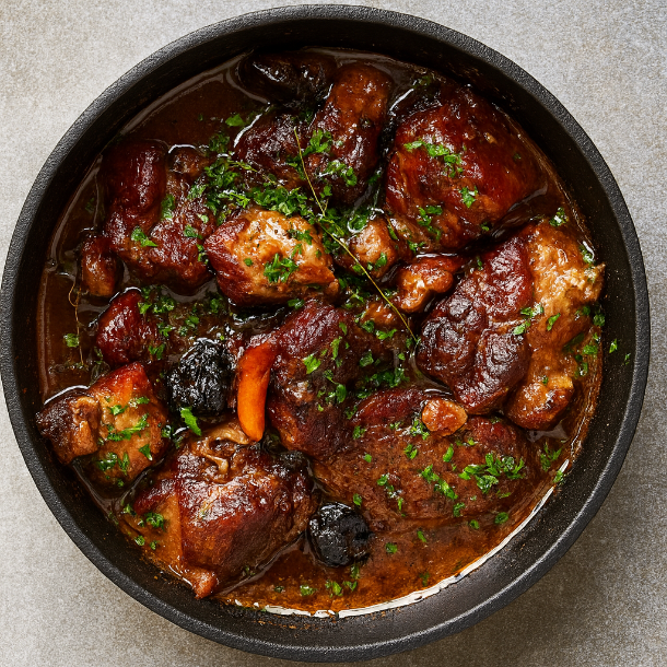 Råvarer og tilberedning: Kødet simrer langsomt i mørk øl og en nøje udvalgt krydderiblanding, så det bliver mørt og fyldt med dyb, rig smag. Den aromatiske sauce balancerer kødet og skaber en god simreretoplevelse. Server med kartoffelmos, rodfrugter, dampede grøntsager eller en frisk salat. Tilsæt skyen fra de braiserede kæber til den varme skysauce. Dette vil ikke kun forstærke smagen, men også skabe en rig og velsmagende sauce, der perfekt komplementerer de møre svinekæber.