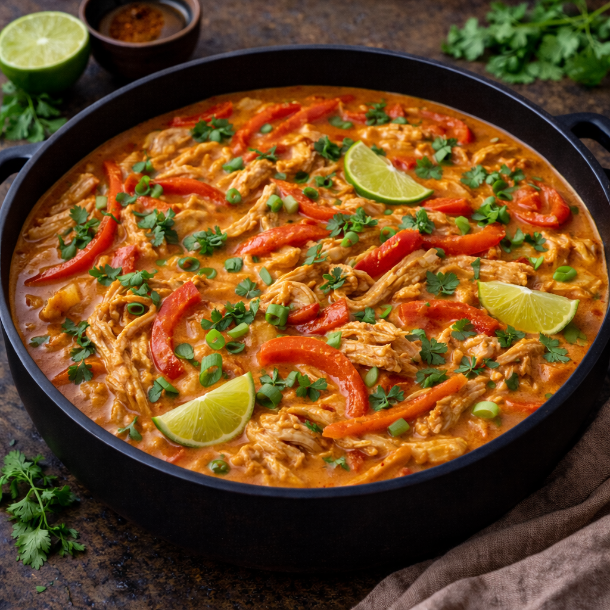 Råvarer og tilberedning: Vores kok har skabt denne populære ret med omhu og fokus på smag. Retten indeholder mørt Slow Cooked Shredded Chicken, sprøde peberfrugter og gulerødder samt en cremet rød karrysovs lavet af kokosmælk, rød karrypasta og nøje afstemte krydderier. Smagen er fyldig og aromatisk, med en mild til medium styrke – tilpas krydret, så alle kan nyde den.