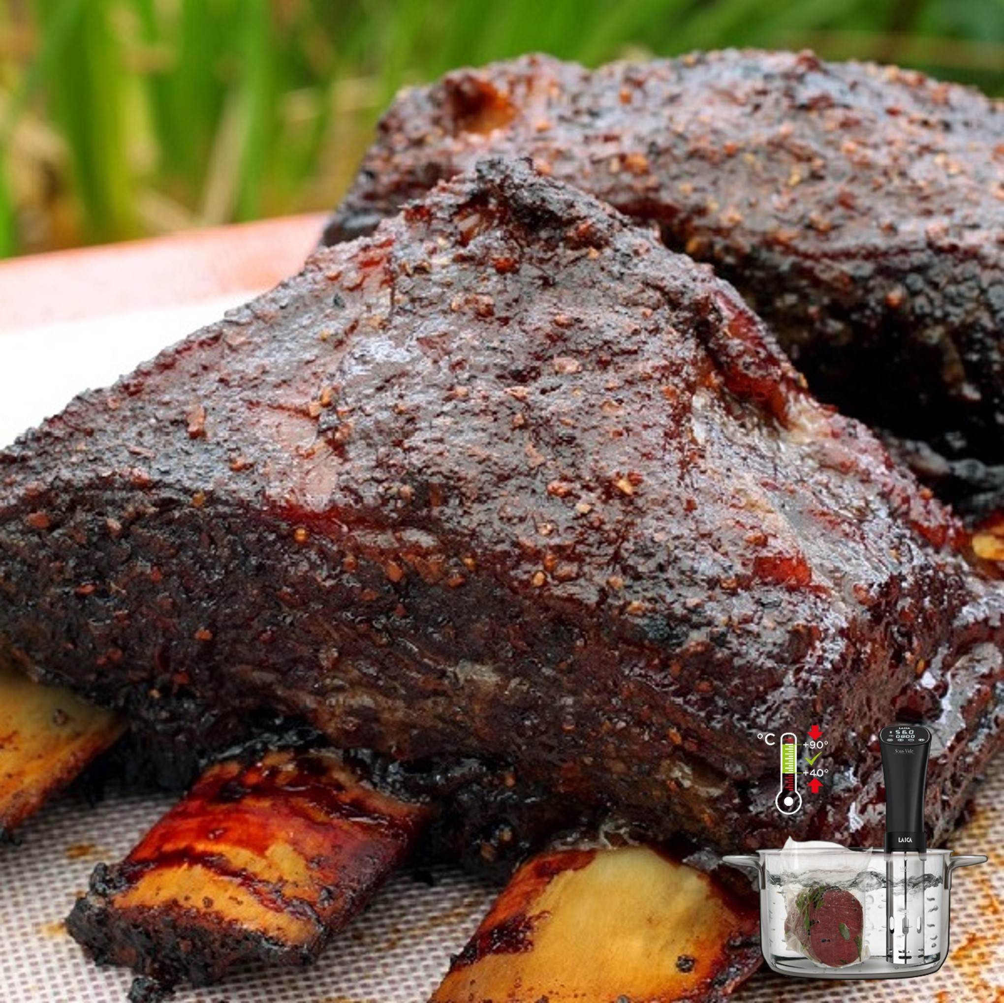 Short Ribs er en udskæring fra den bageste del af dyret med en naturlig fedtmarmorering, der giver struktur og smag. Kødet marineres i 24 timer, krydres med vores egen kryddersalt og lægges på køl i yderligere 24 timer. Derefter tilberedes det sous vide i flere timer for at sikre optimal mørhed. Det betyder, at kødet er klar til en hurtig opvarmning og en afsluttende stegning for at få en sprød stegeskorpe.