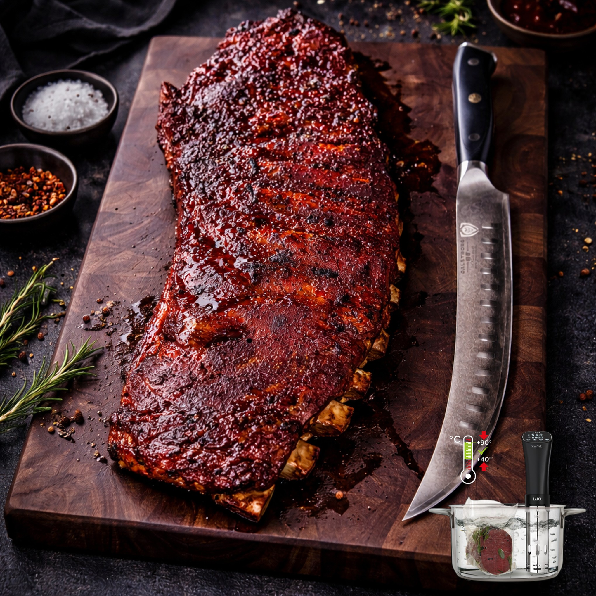 Forbehandling og sous vide: Ribbenene er forarbejdet og tilberedt sous vide, så udskæringens struktur er stabiliseret inden den sidste opvarmning. Denne metode gør produktet velegnet til hurtig færdiggørelse, hvor overfladen kan sættes på grill eller i ovn uden længere tilberedningstid. Produktet leveres som en heat & eat-løsning, hvor formålet er at kombinere ensartet tilberedning med enkel håndtering.