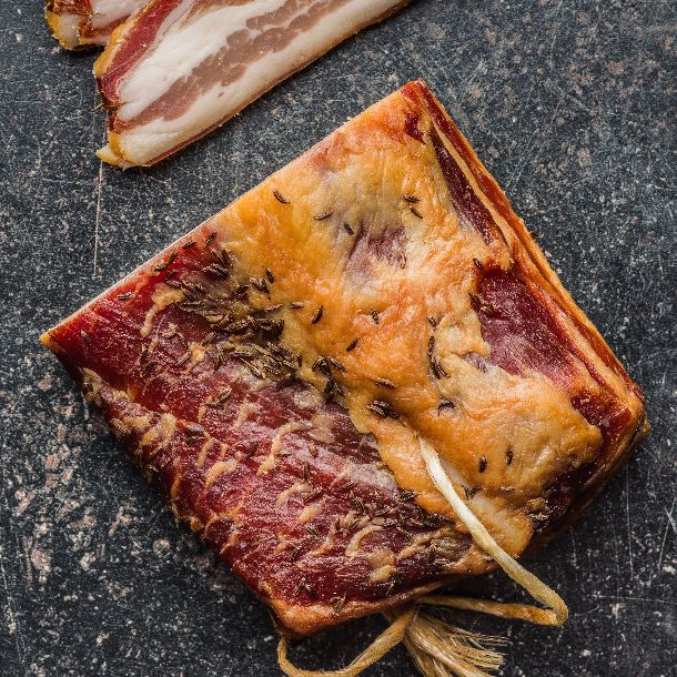 Råvarer og tilberedning: Baconen er lavet uden tilvækst og lufttørret i 1 uge for at intensivere smagen og bevare saftigheden. Sværen er bevaret for optimal smag og holdbarhed, og langtidsrøgningen over bøgeflis giver det aroma og minimal stegesvind. Resultatet er ensartet, høj kvalitetsbacon, der steges sprødt hver gang.